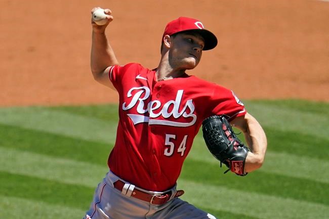 Cincinnati Reds starting pitcher Sonny Gray throws to the Los Angeles Dodgers during the first inning of a baseball game Wednesday, April 28, 2021, in Los Angeles. (AP Photo/Marcio Jose Sanchez)