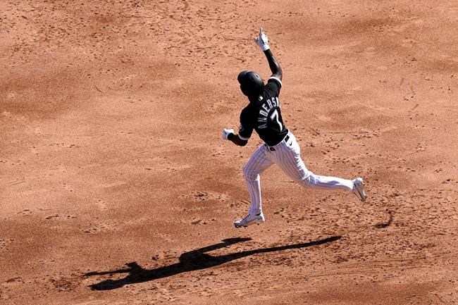 Chicago White Sox's Tim Anderson points to the right field bleachers where he hit his grand slam off Cleveland Indians starting pitcher Triston McKenzie during the second inning of a baseball game Saturday, May 1, 2021, in Chicago. (AP Photo/Charles Rex Arbogast)