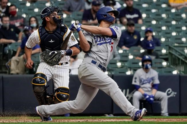 Los Angeles Dodgers' Corey Seager hits an RBI triple during the third inning of a baseball game against the Milwaukee Brewers Saturday, May 1, 2021, in Milwaukee. (AP Photo/Morry Gash)