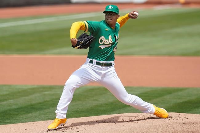 Oakland Athletics' Jesus Luzardo pitches against the Baltimore Orioles during the first inning of a baseball game in Oakland, Calif., Saturday, May 1, 2021. (AP Photo/Jeff Chiu)