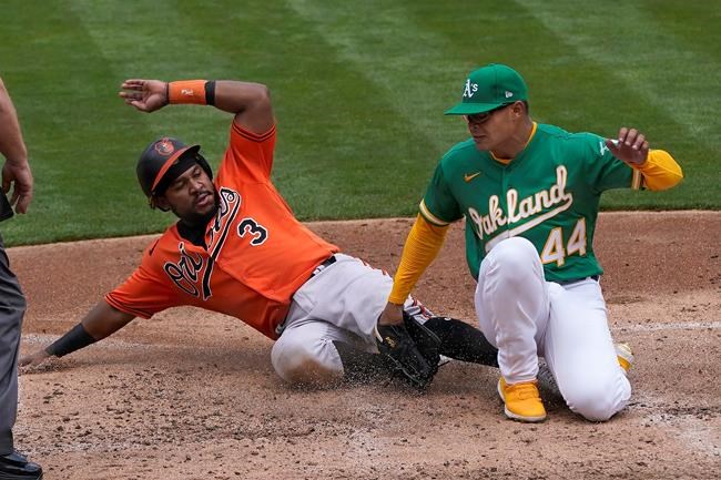 Baltimore Orioles' Maikel Franco (3) slides home to score against Oakland Athletics pitcher Jesus Luzardo (44) during the third inning of a baseball game in Oakland, Calif., Saturday, May 1, 2021. (AP Photo/Jeff Chiu)