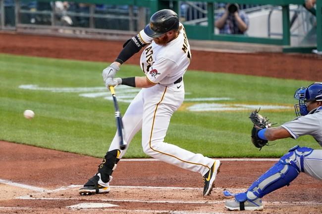 Pittsburgh Pirates' Colin Moran hits a single to drive in Bryan Reynolds from second in the first inning of a baseball game against the Kansas City Royals, Tuesday, April 27, 2021, in Pittsburgh. (AP Photo/Keith Srakocic)