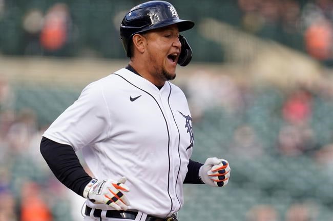 Detroit Tigers' Miguel Cabrera reacts hitting a one-run single against the Minnesota Twins in the seventh inning of a baseball game in Detroit, Saturday, May 8, 2021. (AP Photo/Paul Sancya)