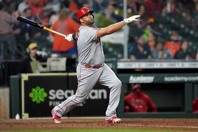 FILE - Los Angeles Angels' Albert Pujols hits a two-run home run against the Houston Astros during the sixth inning of a baseball game in Houston, in this Thursday, April 22, 2021, file photo. Pujols has been designated for assignment by the Los Angeles Angels, abruptly ending the 41-year-old superstar slugger's decade with his second major league team. The Angels announced the move Thursday, May 6, 2021, a day after Pujols wasn't in their lineup for their fourth consecutive loss. (AP Photo/David J. Phillip, File)