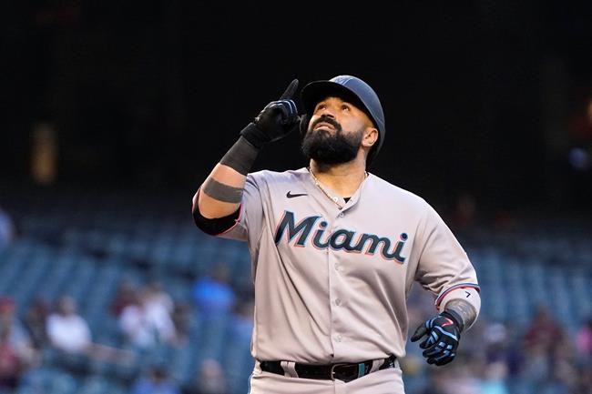 Miami’s Adam Duvall and Jon Berti both had two hits. Sandy Leon hit a solo homer in the second.