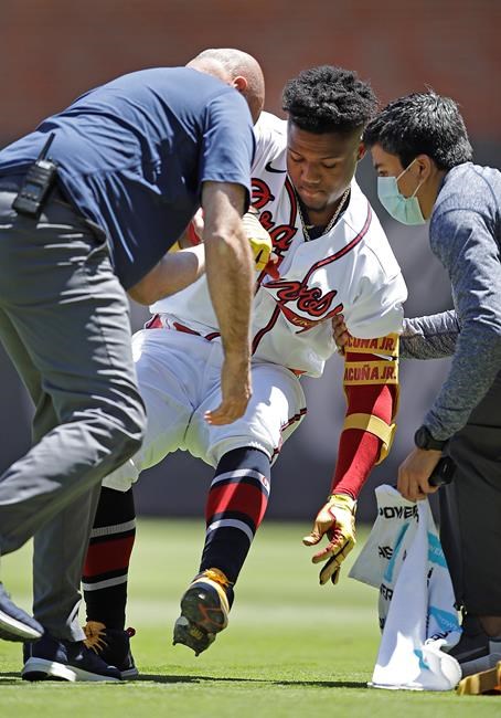 Acuña led off the game with his major league-high 12th homer, then got hurt while trying to beat out a grounder to third base.
