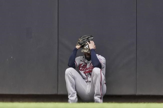 Atlanta Braves' Ender Inciarte reacts after failing to catch a two-run home run hit by Milwaukee Brewers' Avisail Garcia during the fifth inning of a baseball game Sunday, May 16, 2021, in Milwaukee. (AP Photo/Morry Gash)