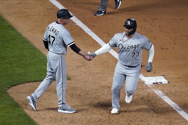 Chicago White Sox's Yermin Mercedes, right, is congratulated by third base coach Joe McEwing after his home run off Minnesota Twins' Willians Astudillo in the ninth inning of a baseball game, Monday, May 17, 2021, in Minneapolis. (AP Photo/Jim Mone)