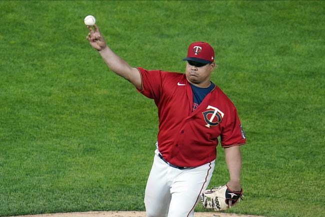 Minnesota Twins' Willians Astudillo moved from catcher to pitcher against the Chicago White Sox in the ninth inning of a baseball game, Monday, May 17, 2021, in Minneapolis. (AP Photo/Jim Mone)