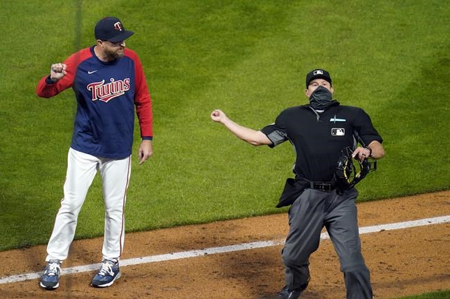 Minnesota Twins manager Rocco Baldelli, left, is ejected by home plate umpire Jim Reynolds after complaining about the ejection of pitcher Tyler Duffey in the seventh inning of the team's baseball game against the Chicago White Sox on Tuesday, May 18, 2021, in Minneapolis. (AP Photo/Jim Mone)