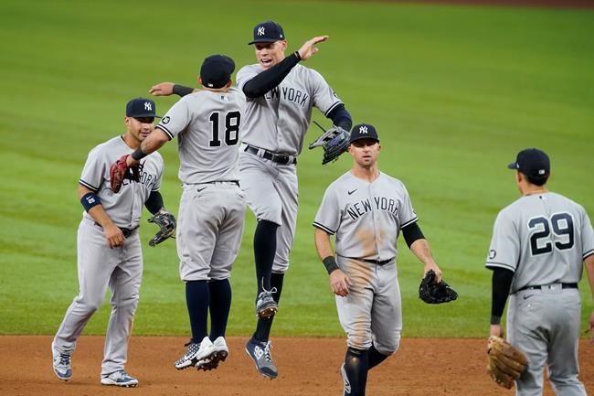 ARLINGTON, Texas (AP) — Domingo Germán pitched seven scoreless innings, Gio Urshela and Aaron Judge delivered RBI singles as pinch-hitters in the seventh inning and the New York Yankees followed Corey KJuber’s no-hitter by beating the Texas Rangers 2-0 on Thursday.