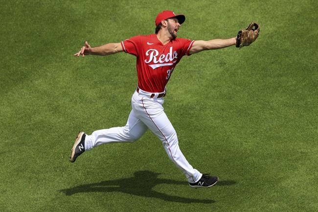 Cincinnati Reds' Max Schrock leaps to make a catch on a fly ball during the third inning of a baseball game in Cincinnati, Sunday, May 23, 2021. (AP Photo/Aaron Doster)
