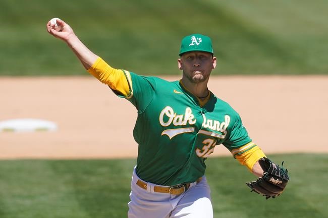 Oakland Athletics' James Kaprielian pitches against the Seattle Mariners during the seventh inning of a baseball game in Oakland, Calif., Wednesday, May 26, 2021. (AP Photo/Jeff Chiu)