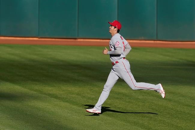 Los Angeles Angels' Shohei Ohtani warms up before the team's baseball game against the Oakland Athletics in Oakland, Calif., Thursday, May 27, 2021. (AP Photo/Jeff Chiu)