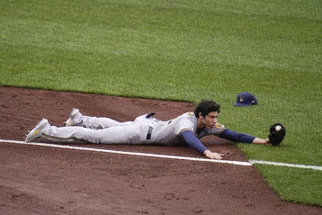 Milwaukee Brewers left fielder Christian Yelich makes a diving catch on a ball hit by Washington Nationals' Josh Bell during the first inning in the first baseball game of a doubleheader, Saturday, May 29, 2021, in Washington. (AP Photo/Julio Cortez)