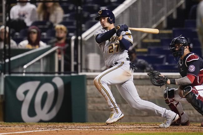 Milwaukee Brewers' Willy Adames follows through on his swing while hitting an RBI single that scored Christian Yelich during the sixth inning in the second baseball game of a doubleheader against the Washington Nationals, Saturday, May 29, 2021, in Washington. (AP Photo/Julio Cortez)
