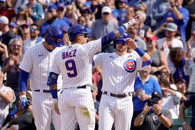 Chicago Cubs' Javier Baez (9) points to the fans as he celebrates his two-run home run off San Diego Padres relief pitcher Miguel Diaz with Anthony Rizzo, left, and Ian Happ in the seventh inning of a baseball game Wednesday, June 2, 2021, in Chicago. (AP Photo/Charles Rex Arbogast)