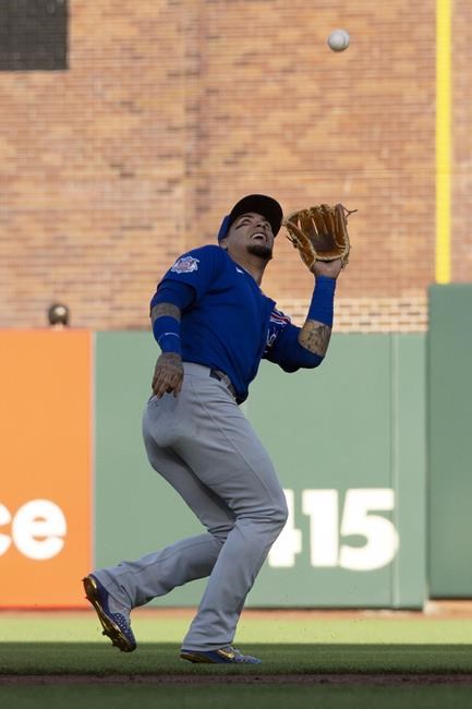 Chicago Cubs shortstop Javier Báez (9) makes the catch of a popup off the bat of San Francisco Giants' LaMonte Wade Jr. during the first inning of game, Thursday, June 3, 2021, in San Francisco. (AP Photo/D. Ross Cameron)