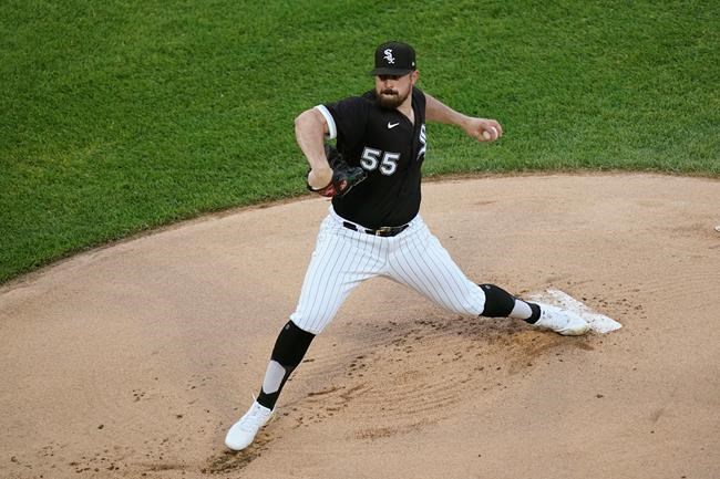 Chicago White Sox starting pitcher Carlos Rodon delivers during the first inning of a baseball game against the Toronto Blue Jays Tuesday, June 8, 2021, in Chicago. (AP Photo/Charles Rex Arbogast)