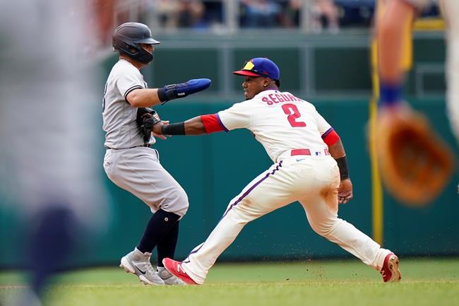 New York, missing Aaron Judge due to back spasms, finished with four hits against Nola, relievers Connor Brogdon and Enyel De Los Santos.