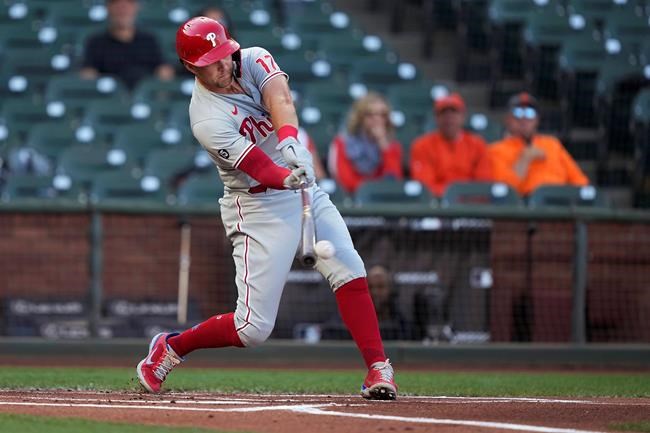 SAN FRANCISCO (AP) — Rhys Hoskins broke out a 2 for 40 slump with a pair of home runs and a career-best six RBIs, leading the Philadelphia Phillies over the San Francisco Giants 13-6 on Saturday.