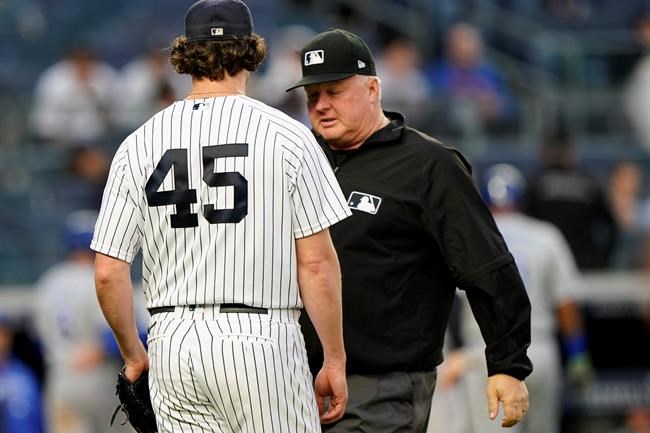 Third base umpire Bill Miller, right, stop inspect New York Yankees starting pitcher Gerrit Cole, left, for foreign substances after the top of the third inning of a baseball game against the Kansas City Royals, Tuesday, June 22, 2021, at Yankee Stadium in New York. (AP Photo/Kathy Willens)