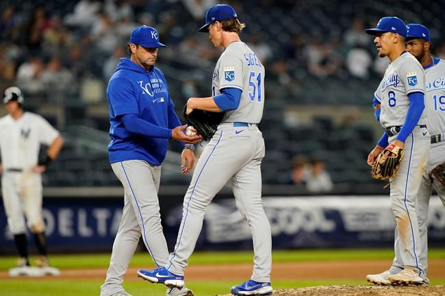 Kansas City Royals manager Mike Matheny takes the ball from Royals starting pitcher Brady Singer (51) with bases loaded in the fourth inning of a baseball game against the New York Yankees, Tuesday, June 22, 2021, at Yankee Stadium in New York. (AP Photo/Kathy Willens)