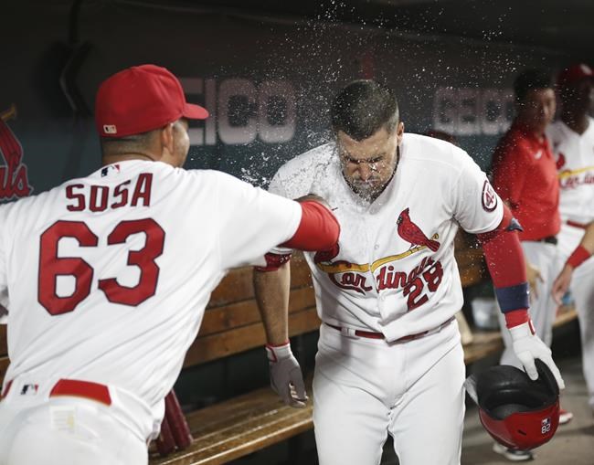 St. Louis Cardinals' Nolan Arenado (28) is doused with water by Edmundo Sosa after hitting a two-run home run in the fifth inning of the team's baseball game against the Arizona Diamondbacks, Tuesday, June 29, 2021, in St. Louis. (AP Photo/Tom Gannam)