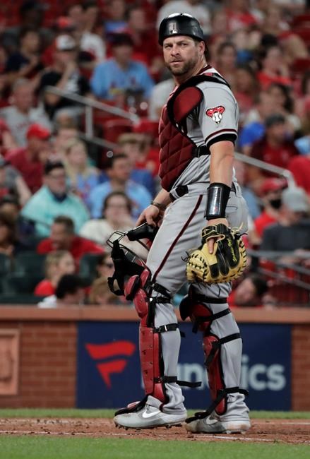 Arizona Diamondbacks catcher Stephen Vogt reacts after he was hit by the bat after St. Louis Cardinals' Edmundo Sosa singled and let go of the bat on the follow-through during the sixth inning of a baseball game Tuesday, June 29, 2021, in St. Louis. (AP Photo/Tom Gannam)