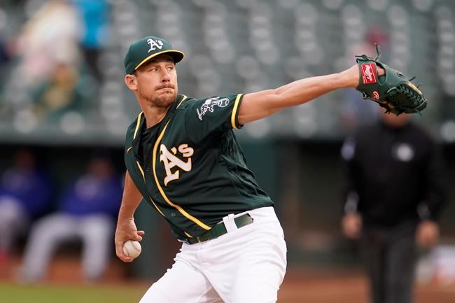 Oakland Athletics' Chris Bassitt pitches against the Texas Rangers during the first inning of a baseball game in Oakland, Calif., Wednesday, June 30, 2021. (AP Photo/Jeff Chiu)