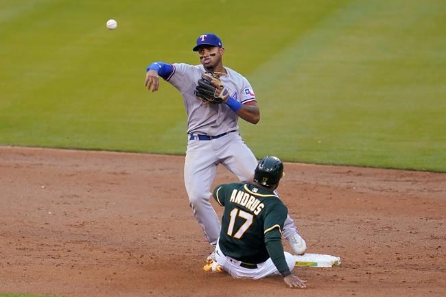 Texas Rangers' Andy Ibanez, top, throws to first base after forcing out Oakland Athletics' Elvis Andrus (17) at second base on a ball hit Matt Olson, who was safe during the third inning of a baseball game in Oakland, Calif., Wednesday, June 30, 2021. (AP Photo/Jeff Chiu)