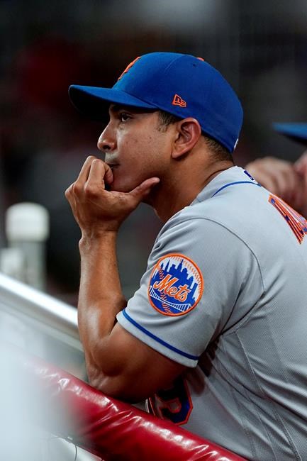 New York Mets manager Luis Rojas watches from the dugout during the team's baseball game against the Atlanta Braves on Thursday, July 1, 2021, in Atlanta. (AP Photo/John Bazemore)