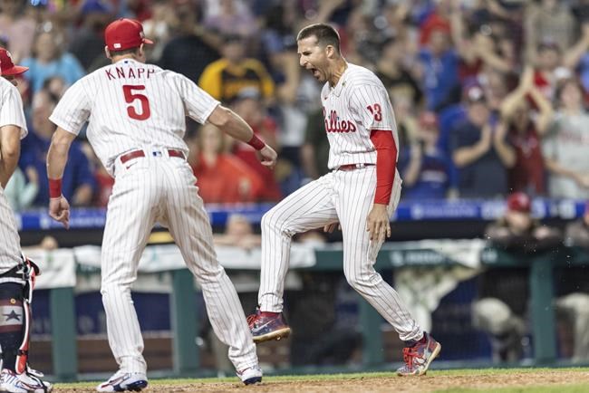 Suarez was better in the 10th, retiring all three batters. That set up Miller, who drove a slider from Austin Adams (2-2) deep to right-center with runners on first and second and one out. Miller rounded the bases as if it were a homer, but the ball bounced off the wall. It was good enough to score Andrew McCutchen from second.