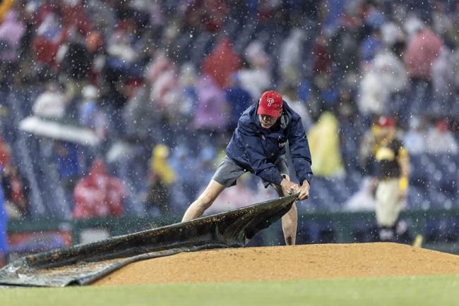 A grounds crew member cover the mound during a rain delay in the fourth inning of a baseball game between the Philadelphia Phillies and the San Diego Padres, Saturday, July 3, 2021, in Philadelphia. (AP Photo/Laurence Kesterson)