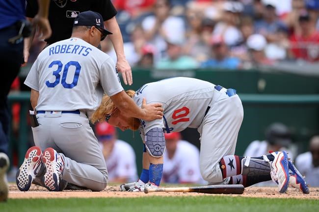 Los Angeles Dodgers manager Dave Roberts (30) tends to Justin Turner (10) after Turner was hit by a pitch from Washington Nationals reliever Wander Suero during the ninth inning of a baseball game, Sunday, July 4, 2021, in Washington. Turner stayed in the game. (AP Photo/Nick Wass)