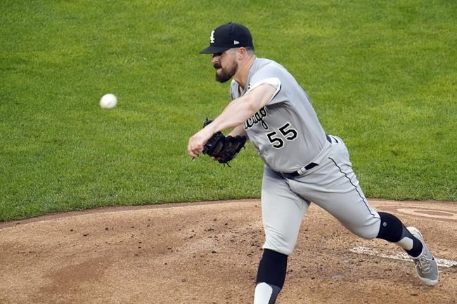 Chicago White Sox pitcher Carlos Rodon throws against the Minnesota Twins in the first inning of a baseball game Tuesday, July 6, 2021, in Minneapolis. (AP Photo/Jim Mone)