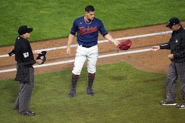 Minnesota Twins pitcher Jose Berrios, center, offers his glove for inspection to umpires during the fifth inning of the team's baseball game against the Chicago White Sox, Tuesday, July 6, 2021, in Minneapolis. (AP Photo/Jim Mone)