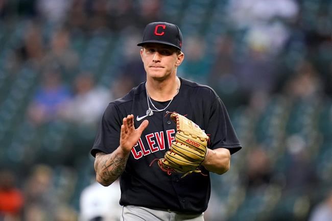 FILE - In this Thursday, May 13, 2021 file photo, Cleveland Indians starting pitcher Zach Plesac reacts after the fourth inning of the team's baseball game against the Seattle Mariners in Seattle. Indians starter Zach Plesac has been activated from the injured list and will make his first start since breaking his thumb in May while removing his undershirt. Plesac will start Thursday night, July 8, 2021 against the Kansas City Royals as the Indians try to end a nine-game losing streak _ the club's longest since 2012. (AP Photo/Elaine Thompson, File)