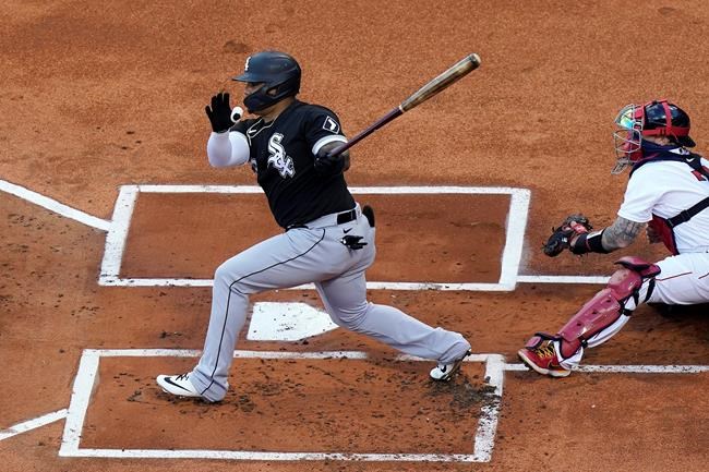 FILE - In this April 18, 2021, file photo, Chicago White Sox's Yermin Mercedes swings at a pitch next to Boston Red Sox's Christian Vazquez during a baseball game in Boston. Mercedes, the surprising rookie who helped carry the White Sox with his booming bat early in the season and got sent to the minors following a prolonged slump, says he is stepping away from baseball. Mercedes announced his decision on Instagram on Wednesday, July 21. (AP Photo/Steven Senne, File)
