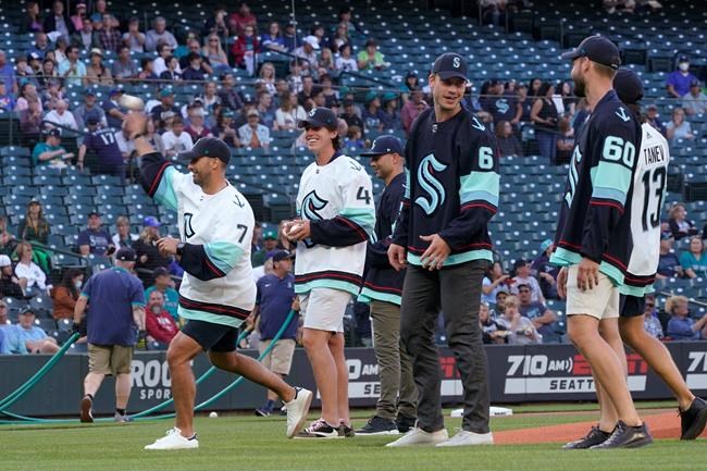 Seattle Kraken forward Jordan Eberle, left, throws out a first pitch as teammates watch before a baseball game between the Seattle Mariners and the Oakland Athletics, Thursday, July 22, 2021, in Seattle. Eberle was selected by the Kraken on Wednesday from the New York Islanders in the NHL expansion draft. (AP Photo/Ted S. Warren)
