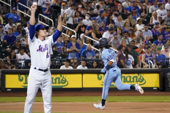 New York Mets relief pitcher Drew Smith, left, waits as Toronto Blue Jays' Bo Bichette runs the bases after hitting a home run during the seventh inning of a baseball game Saturday, July 24, 2021, in New York. (AP Photo/Mary Altaffer)