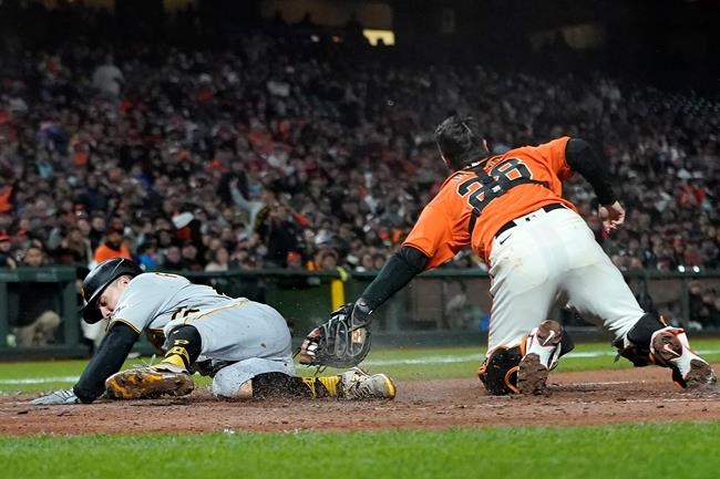 Pittsburgh Pirates' Adam Frazier, left, scores past San Francisco Giants catcher Buster Posey during the seventh inning of a baseball game in San Francisco, Friday, July 23, 2021. (AP Photo/Jeff Chiu)