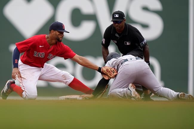 New York Yankees' Gleyber Torres, front right, steals second base as Boston Red Sox's Xander Bogaerts, left, tries to tag him in the eighth inning of a baseball game, Sunday, July 25, 2021, in Boston. (AP Photo/Steven Senne)