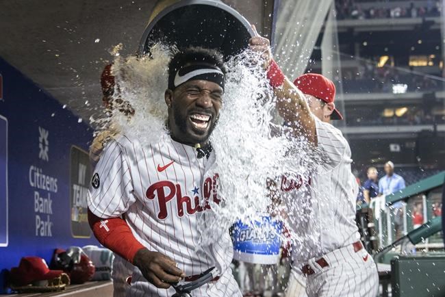 Rhys Hoskins also had a three-run homer for the second-place Phillies, who are 3 1/2 games behind the New York Mets in the NL East.