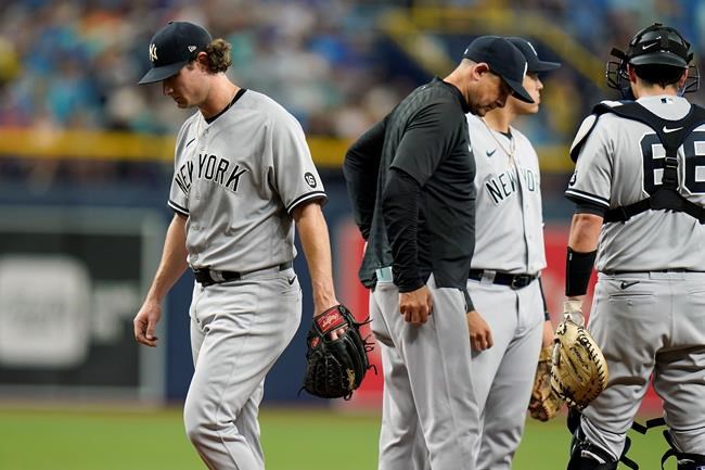 Randy Arozarena hit a high foul ball off Cole just behind the plate in the third inning that got stuck on an overhanging structure at Tropicana Field. Cole, catcher Kyle Higashioka and Arozarena all had looks of confusion as they looked up for the ball.