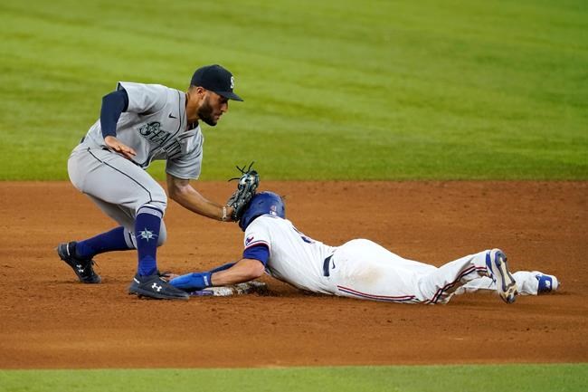 Seattle Mariners second baseman Abraham Toro attempts the tag on Texas Rangers' Eli White, who stole second during the fifth inning of a baseball game in Arlington, Texas, Saturday, July 31, 2021. (AP Photo/Tony Gutierrez)