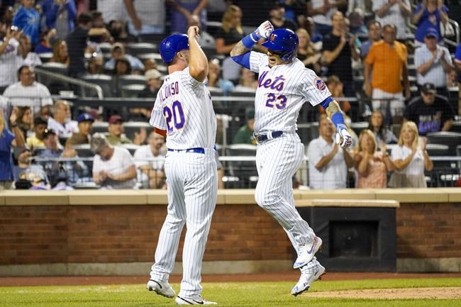 The star slugger fell inches short of matching the major league record with a home run in eight consecutive games, but Javier Báez did clear the fence in his New York debut and the Mets rallied past the Cincinnati Reds 5-4 in 10 innings Saturday night.