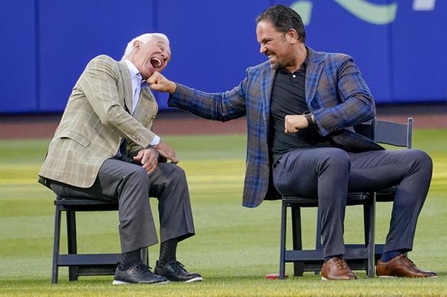 Former New York Mets catcher Mike Piazza, right, and former Mets manager Bobby Valentine joke around during a Mets Hall of Fame induction ceremony, Saturday, July 31, 2021, in New York. (AP Photo/Mary Altaffer)