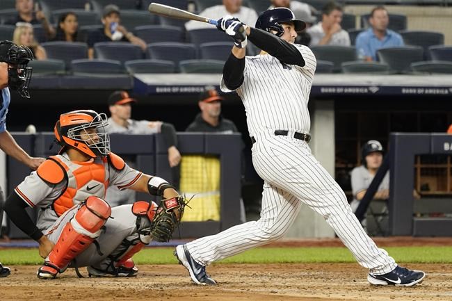 NEW YORK (AP) — Recently acquired Anthony Rizzo homered again, DJ LeMahieu drove in four runs and the New York Yankees beat the Baltimore Orioles 10-3 on Wednesday night.