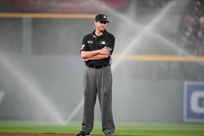 Second base umpire Ryan Additon smiles as sprinklers inadvertently go off in the outfield during the pause between the seventh and eighth innings of a baseball game between the Miami Marlins and the Colorado Rockies, Friday, Aug. 6, 2021, in Denver. (AP Photo/David Zalubowski)
